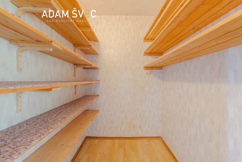 Mezi pokoji najdete praktickou šatnu, která pojme sezónní věci, nebo ji můžete přetvořit na pracovnu. Sice bez přímého větrání, ale jako domácí kancelář poslouží dobře.